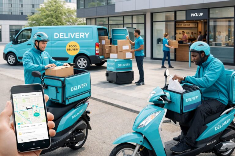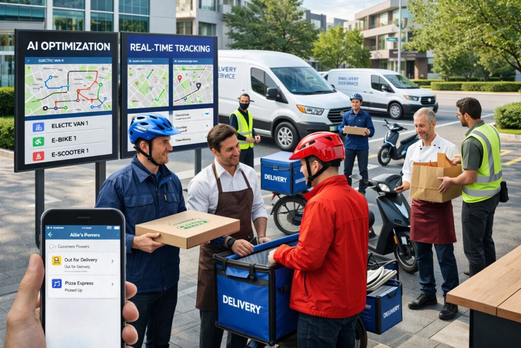 • A fleet of modern delivery vehicles including motorcycles, bikes, and vans